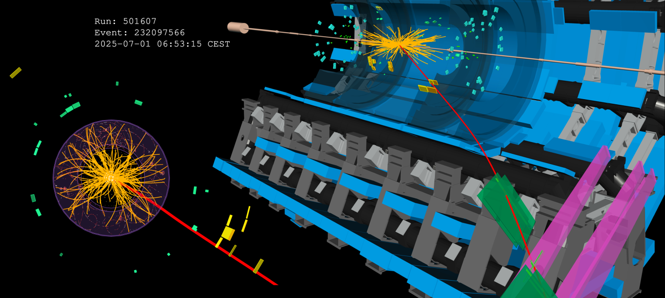 Cover image: Event display of a proton–oxygen collision recorded by the ATLAS Experiment on 1 July 2025. (Image: ATLAS Collaboration/CERN)